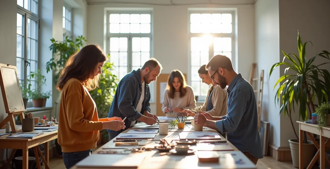Una vez que comprendemos la necesidad de un ecosistema, la pregunta es: ¿dónde se encuentran estos «biotopos» creativos? La respuesta es un híbrido entre el mundo físico y el digital. Los espacios tradicionales siguen siendo insustituibles para forjar lazos basados en la convivencia y la experiencia compartida. Las residencias artísticas, por ejemplo, son inmersiones intensivas que aceleran la creación de vínculos profundos. Los estudios abiertos (open studios) o los talleres compartidos en ciudades como Barcelona, Valencia o Bilbao funcionan como nodos permanentes donde la interacción es diaria y orgánica.