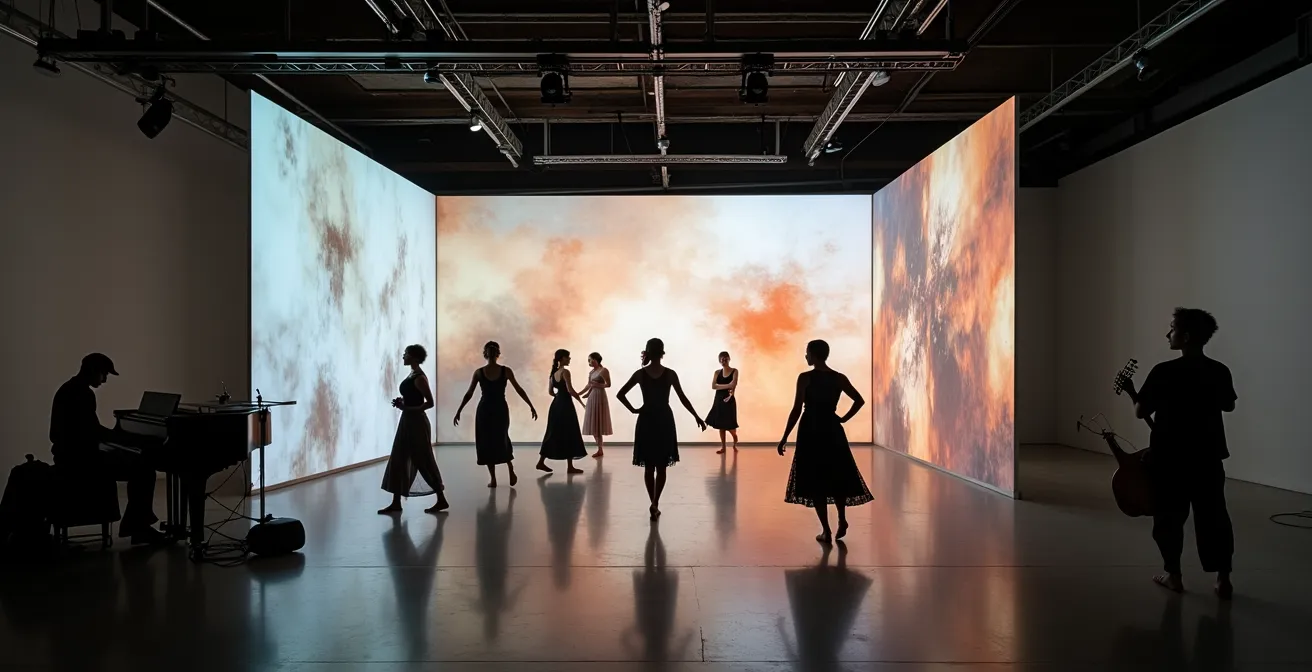Este es el error capital: la yuxtaposición confundida con integración. Ocurre cuando el músico crea su pieza, el coreógrafo la suya y el videoartista la suya, y luego se «juntan» en los ensayos finales. El resultado es una cacofonía de lenguajes que compiten por la atención del espectador. La solución reside en un concepto central: la partitura dramatúrgica integrada. No es un guion de texto, sino un mapa temporal que orquesta la danza, la luz, el sonido y el espacio como una sola entidad.